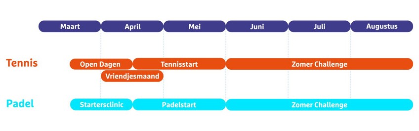 Steeds meer mensen willen gaan tennissen of padellen of overwegen na een langere tijd opnieuw te beginnen. Om deze mensen kennis te laten maken met de sport kan je als vereniging een aantal kennismakingsactiviteiten organiseren. Denk aan een open dag, Startersclinic, de Vriendjesmaand, Tennisstart, Padelstart en de Zomer Challenge. De KNLTB helpt jouw vereniging door de sporten en deze activiteiten extra te promoten met een landelijke campagne. In onderstaande afbeelding kan je zien wanneer welke activiteiten worden gepromoot. De promotie start half maart met de open dagen.