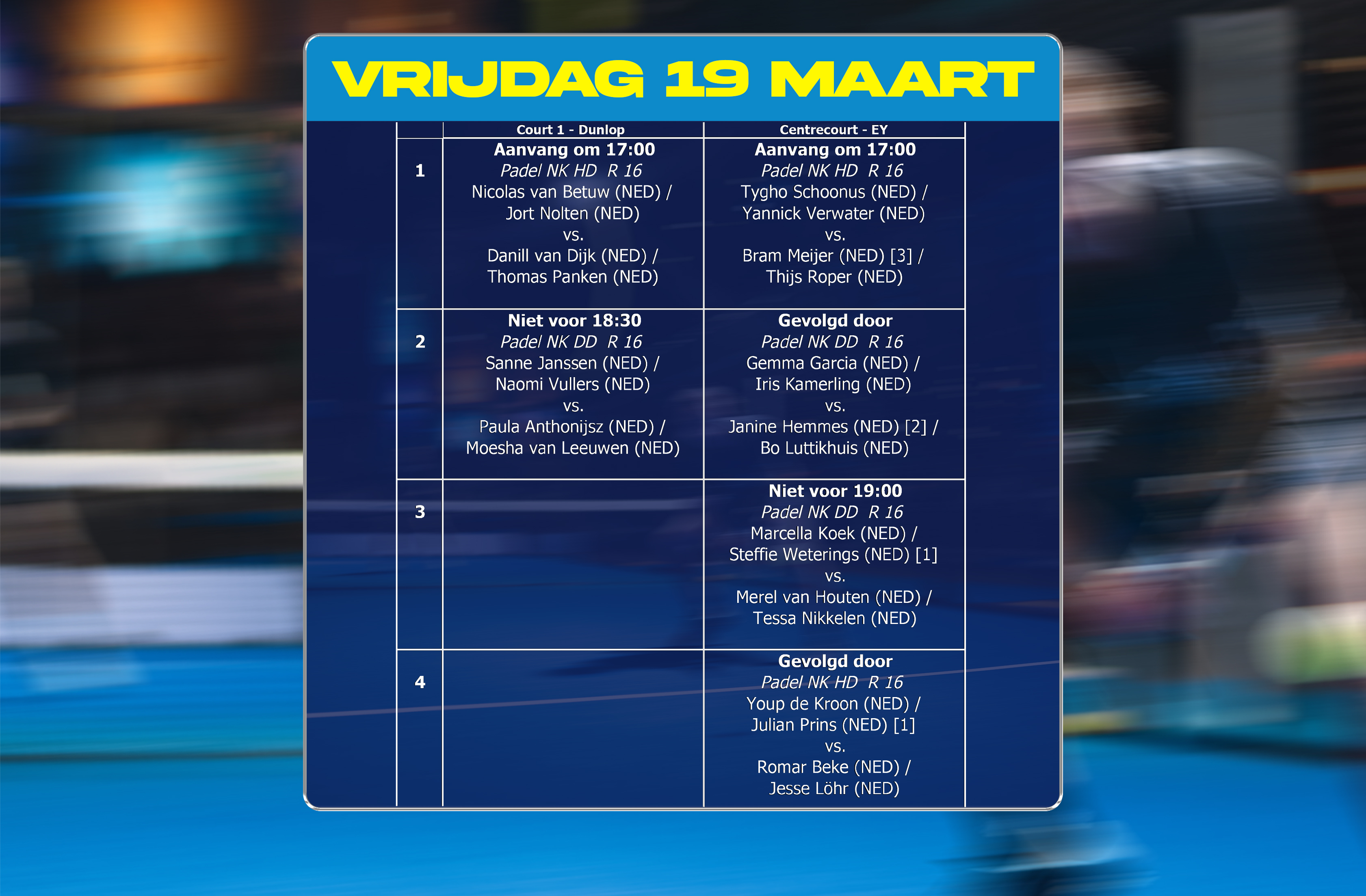 Wedstrijden EY NK Padel 2026 vrijdag 20 maart